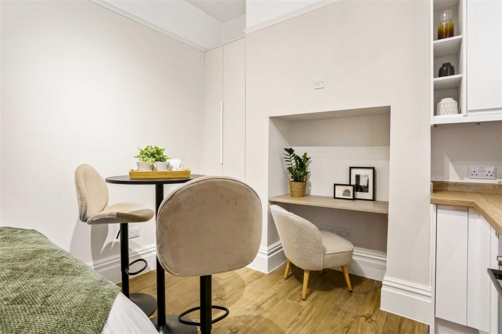 The development caters for professionals, couples and students, this fully furnished studio combines contemporary style with practical living:
