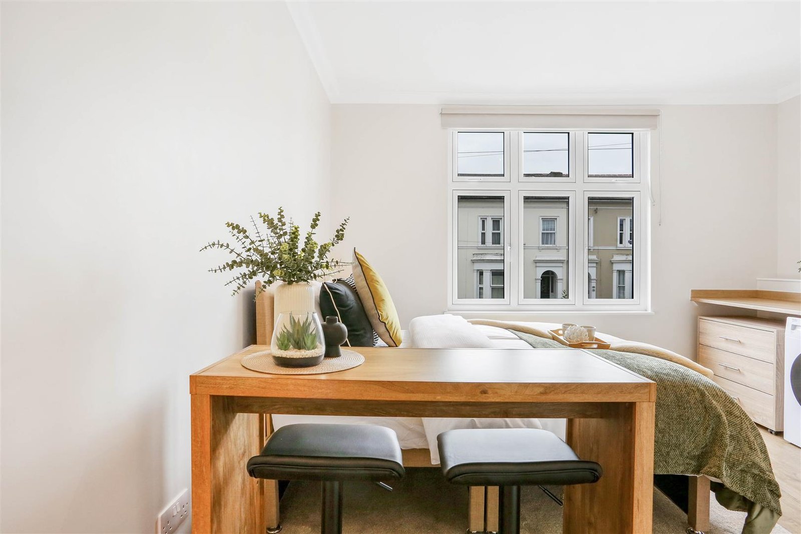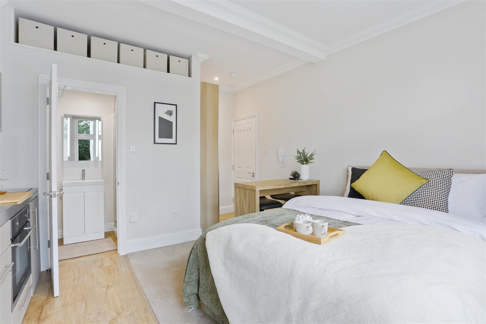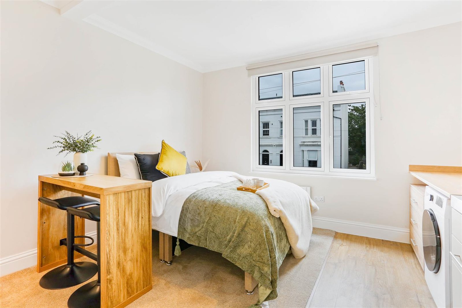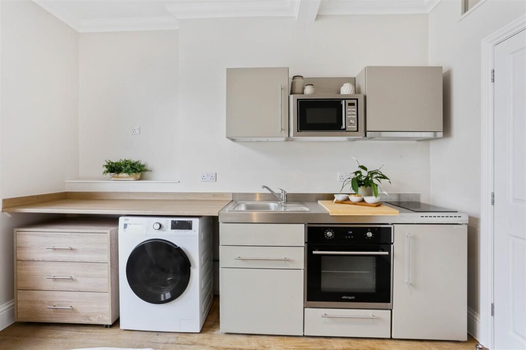 Ideal for professionals, couples, or students, these self-contained studios combine contemporary style with practical living. Each unit is fully furnished and thoughtfully designed, featuring a comfortable double bed with storage underneath, large wardrobe, chest of drawers, and plenty of storage. The modern private kitchen comes fully equipped with a fridge, oven, microwave, two-ring hob, extractor fan, and washer-dryer for everyday convenience. A sleek, en-suite bathroom with high pressure rainfall shower completes each apartment.