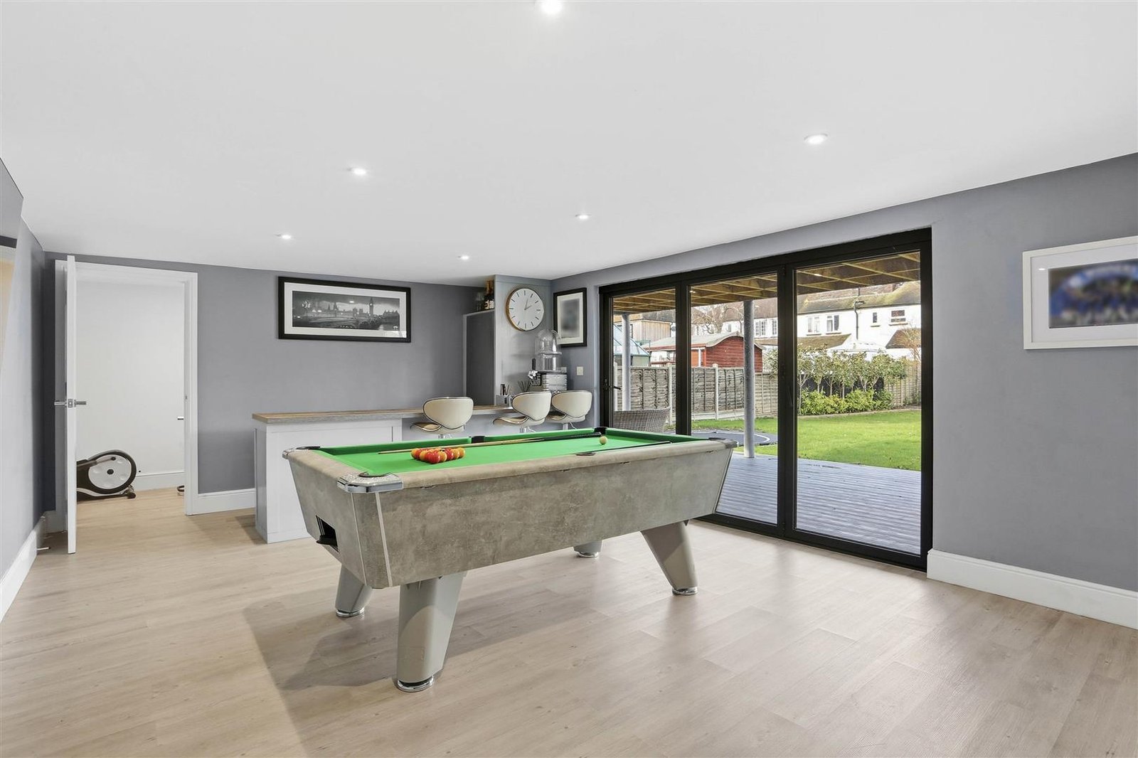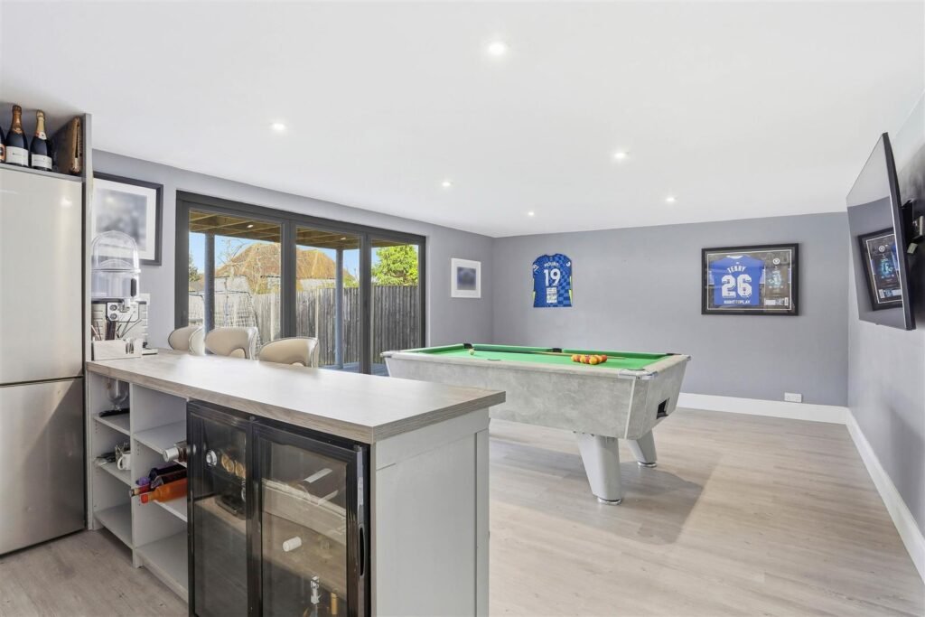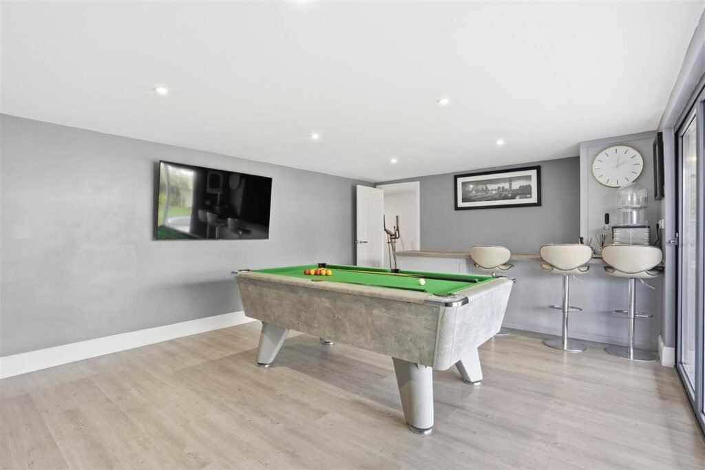 Externally, the rear garden offers a private and enjoyable outdoor setting. To the rear sits a substantial outbuilding incorporating a gym, bar/games room and additional storage — a fantastic addition that lends itself perfectly to entertaining, working from home or personal fitness.