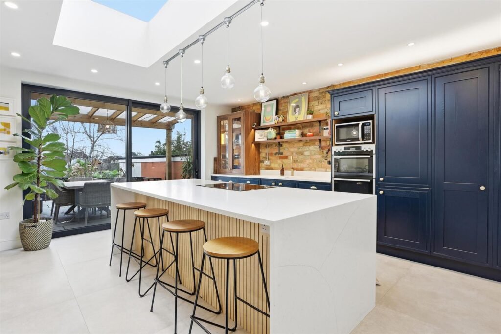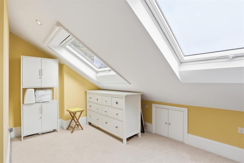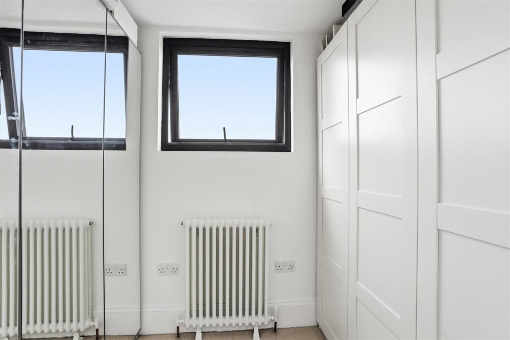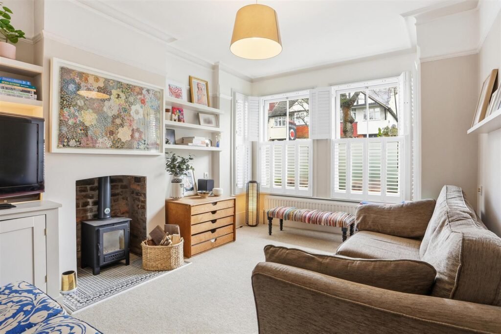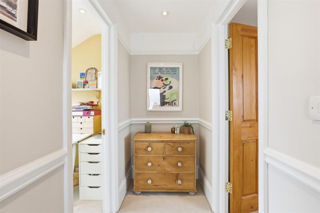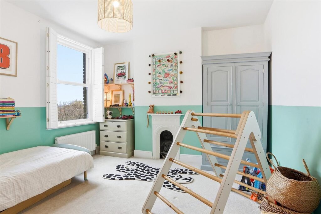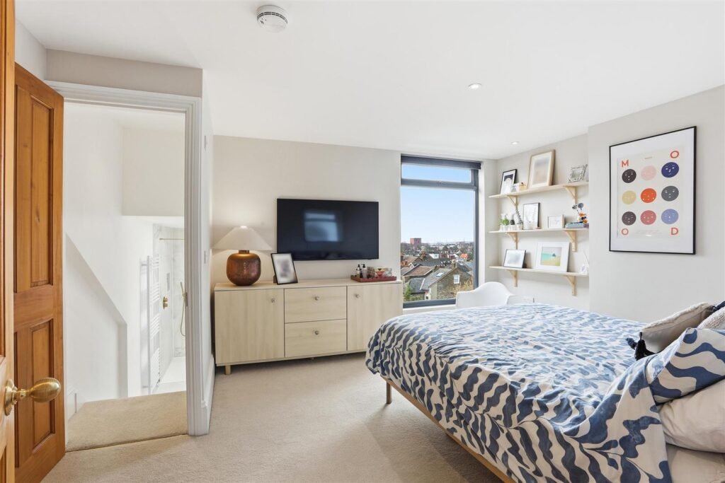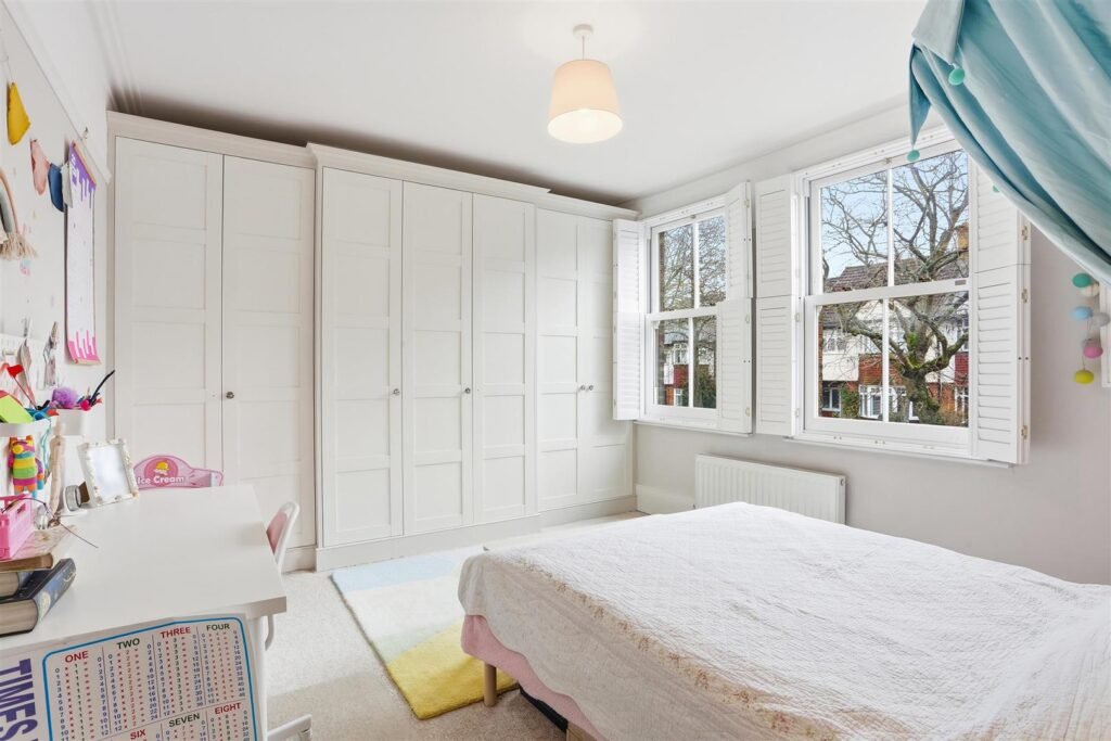 The first floor comprises three bedrooms, including a generous double, alongside a well-appointed family bathroom. The second floor offers two additional bedrooms, with the principal suite benefitting from a dressing room and en-suite, enjoying far-reaching views across West London.