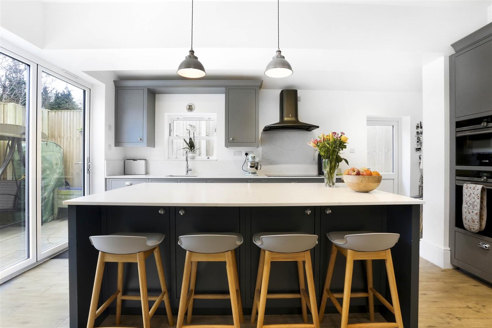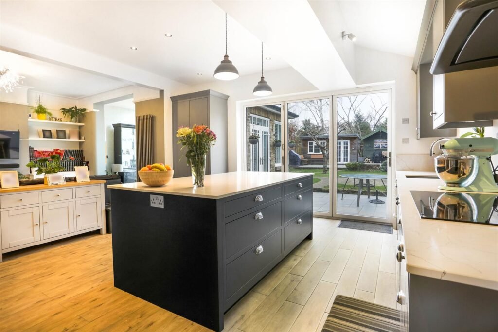 The open plan kitchen/reception area is simply to die for. Offering plenty of space for large family gatherings, with its attractive lounge/dining area offering views out to the rear garden as well as modern kitchen design with access to a separate utility room.